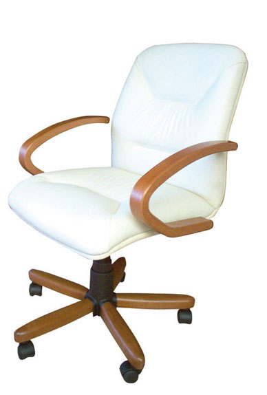 Poltrona con schienale alto o basso, base a 5 razze e braccioli in legno verniciato color ciliegio. Disponibile con alzata a gas e meccanismo synchron.